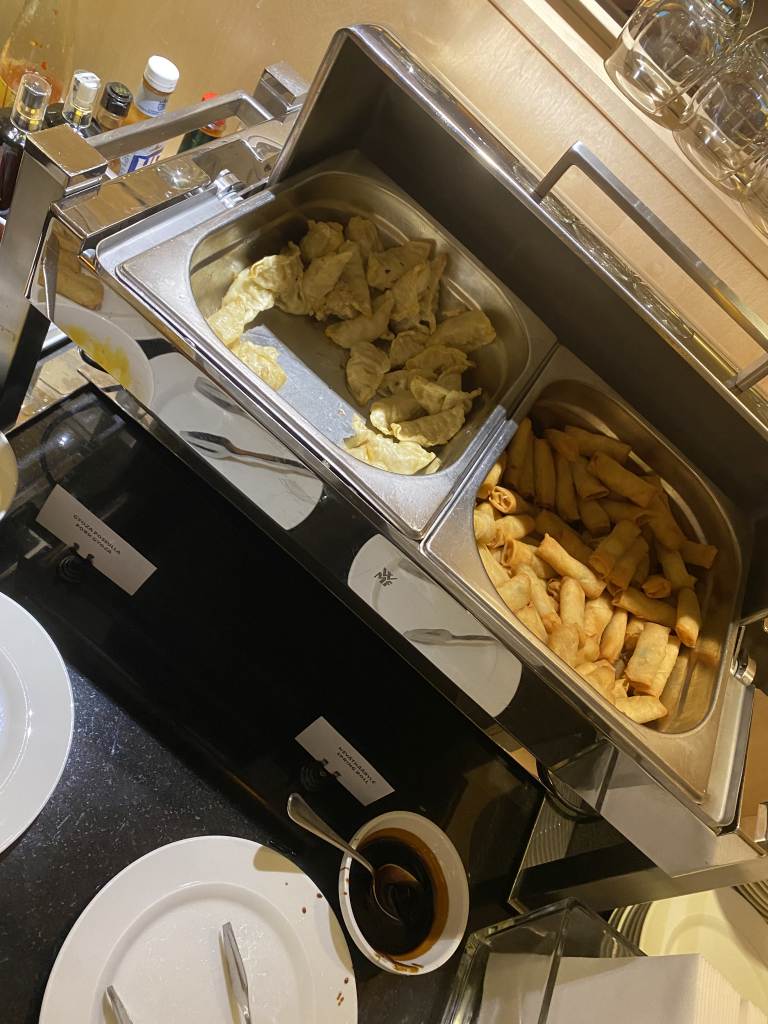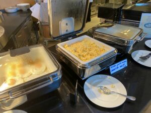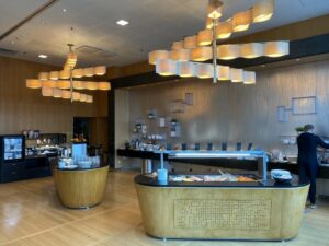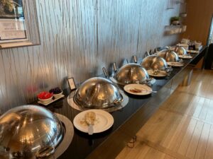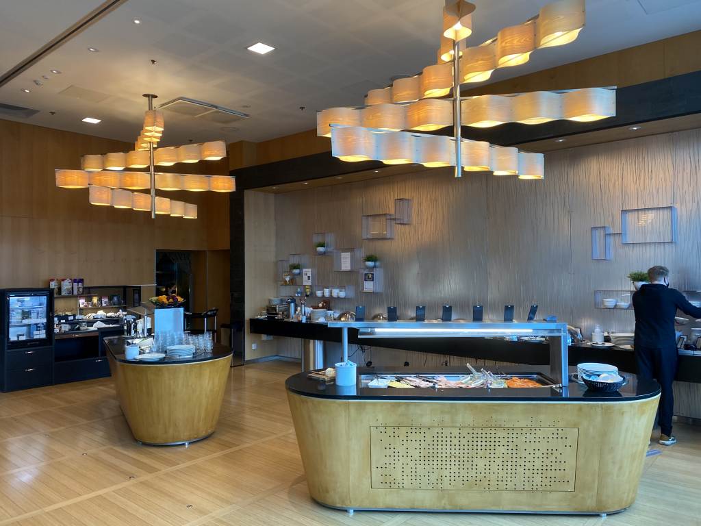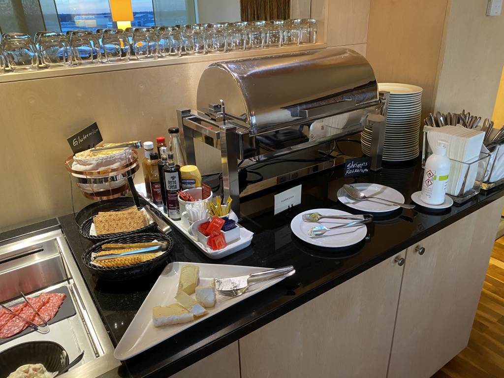 Die Lounge erinnerte mich echt sehr and Hilton Düsseldorf. Mit dem Essbereich, der langen Theke und dem Serviceraum am Ende davon. Allerdings mit dem Unterschied, dass das Essen wieder aufgefüllt wurde.
