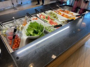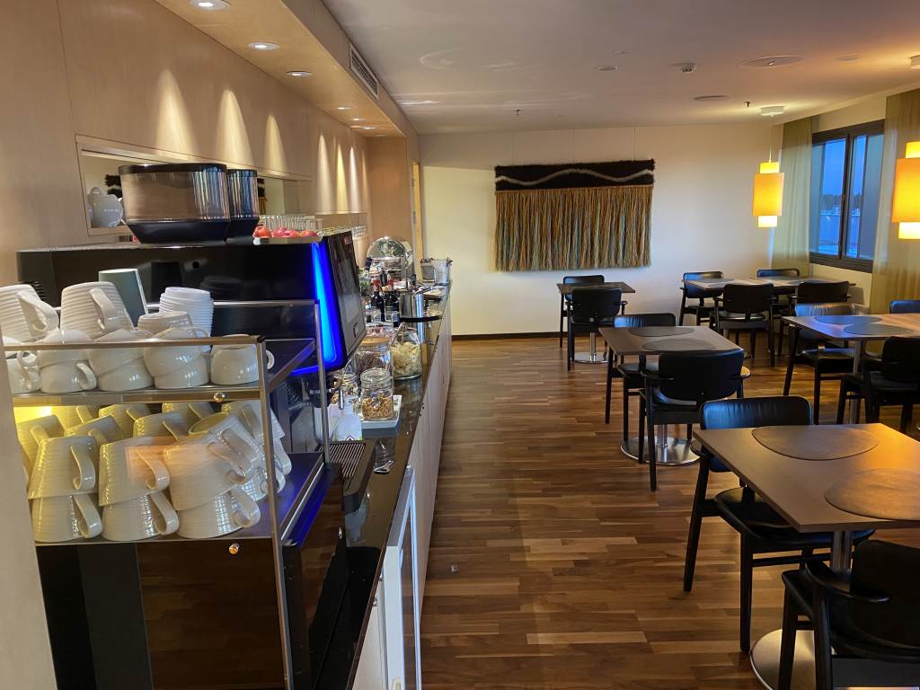 An einer Station werden Eierspeisen, wie gekochte Eier und Rührei sowie wechselnde Variationen, angeboten. Dazu werden auf zwei Inseln Wurst-, Fisch- und Käseaufschnitt, sowie frische Salate und Smoothies angeboten. Eine lange Theke bietet warme Speisen, wie gebackene Bohnen, Rentier-Fleischbällchen, Röstis, Würstchen und co. Ergänzt wird das Büffet noch um eine Station mit Frühstücks-Cerealien und Backwaren. Wobei sich die Auswahl an Backwaren auf süßes Plundergebäck, Toast, Croissants, eine Sorte Brötchen und Brot beschränkte. Das war eher überschaubar.