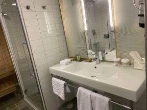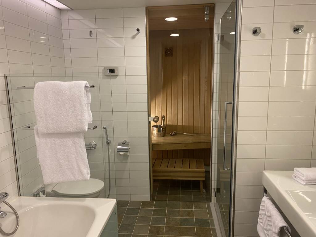 Das Hilton am Flughafen hat Zimmer-Kategorien, die eine private Sauna auf dem Zimmer haben. Und da uns der Gang in die Sauna seit mehr als 1 1/2 Jahren durch unsere beiden Töchter erschwert wird, war das die optimale Gelegenheit.