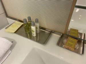 Das Badezimmer bietet sowohl Badewanne als auch separate Dusche. Letztere ist insbesondere nach dem Saunagang natürlich wichtig. Der große Waschtisch mitsamt Spiegel befindet sich an der rechten Wand. Die Pflegeprodukte stammen, wie üblich bei Hilton, aus der Linie Crabtree & Evelyn.