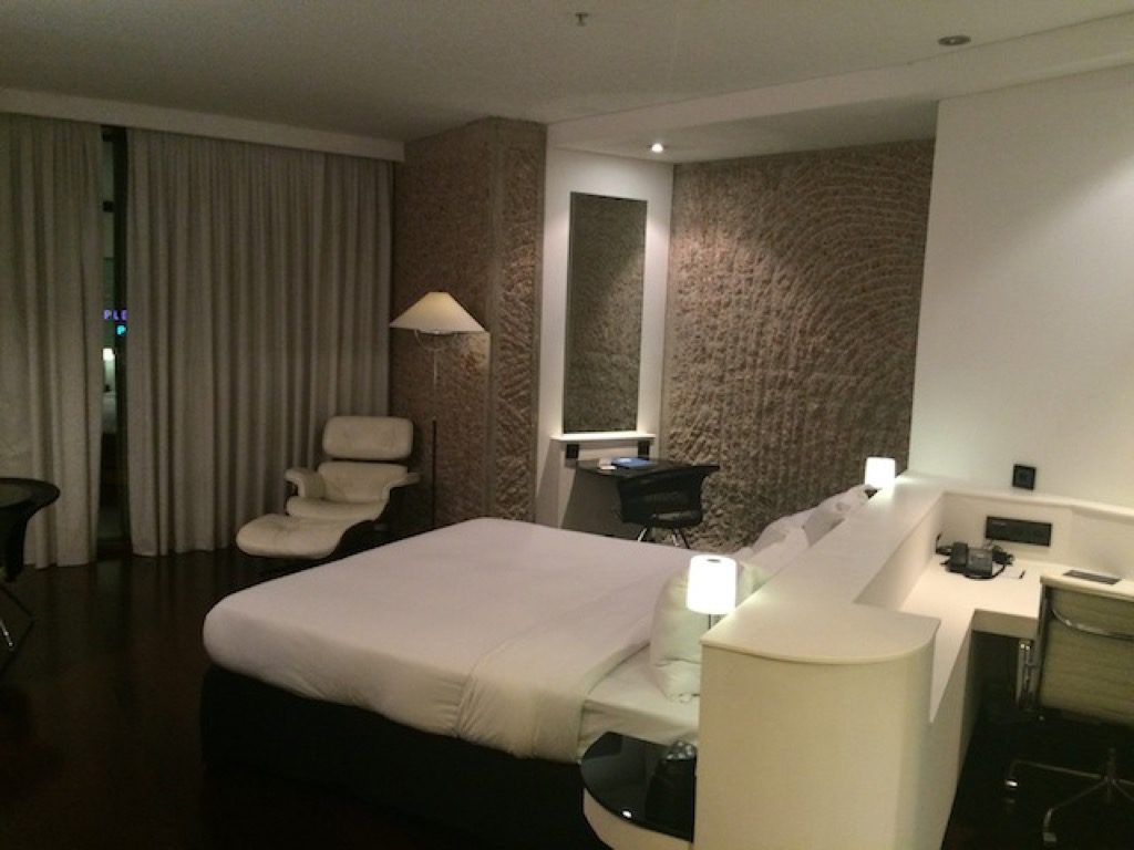 Bei den King Relaxation Room handelte es sich um ein Eckzimmer mit rund 45qm. Es war, typisch für Hilton, modern eingerichtet. Gut hat mir vor allem der Schreibtisch direkt hinter dem Bett gefallen. Dadurch, dass das Bett mitten im Zimmer stand, wirkte das Zimmer aber nicht wirklich größer als ein Standardzimmer, aber man kann es mit Sicherheit auch nicht als beengt beschreiben. Bei der Größe des Zimmers war das allerdings kein Problem. Im Hintergrund kann man das offene Bad sehen.