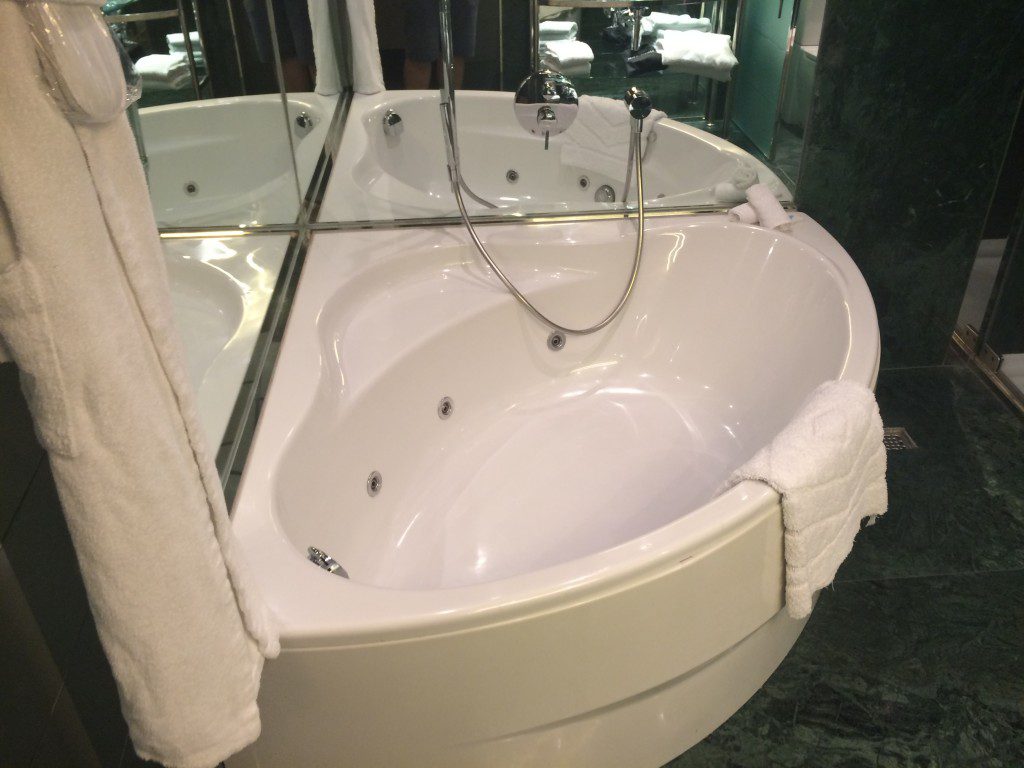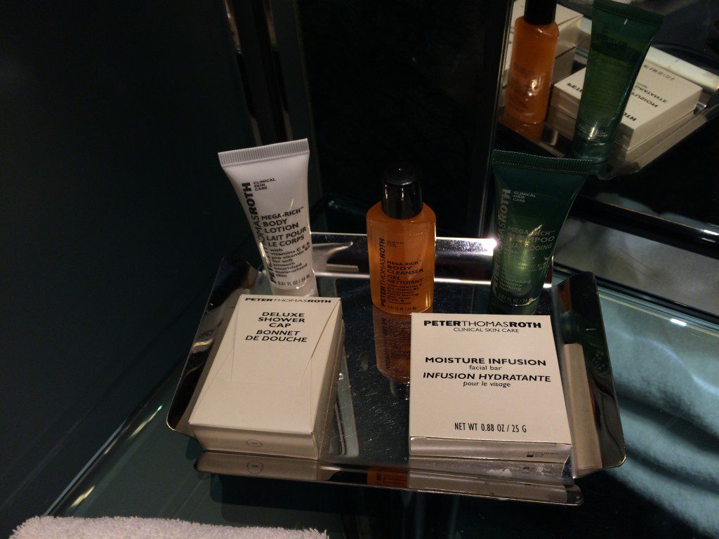 Das Highlight des Zimmers war das Bad. Es war zum Zimmer hin offen gehalten, wobei es mit Glasschiebetüren verschließbar war. In dem modernen Bad gab es neben einer Walk-in Dusche und einer separaten Toilette mit Bidet auch eine große Eckbadewanne mit Whirlpoolfunktion. Die Badezimmer Amenitys von Peter Thomas Roth sind Standart. Leider gab es keine Extras wie Bürste, Zahnbürste oder Conditioner.