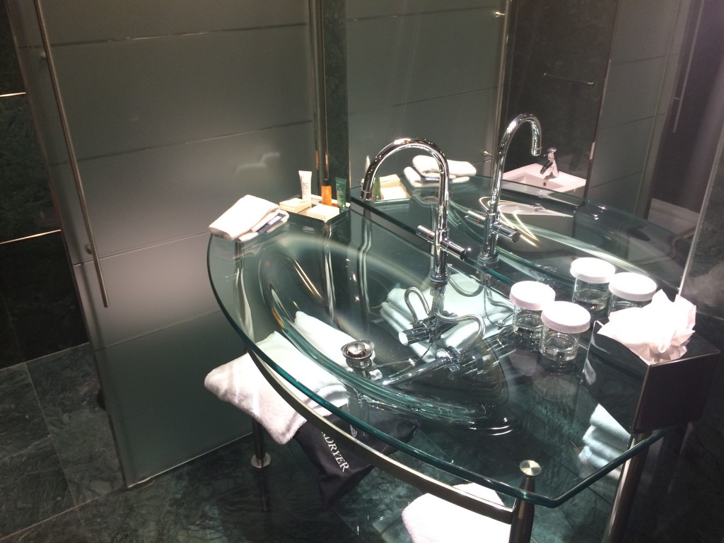 Das Highlight des Zimmers war das Bad. Es war zum Zimmer hin offen gehalten, wobei es mit Glasschiebetüren verschließbar war. In dem modernen Bad gab es neben einer Walk-in Dusche und einer separaten Toilette mit Bidet auch eine große Eckbadewanne mit Whirlpoolfunktion. Die Badezimmer Amenitys von Peter Thomas Roth sind Standart. Leider gab es keine Extras wie Bürste, Zahnbürste oder Conditioner.