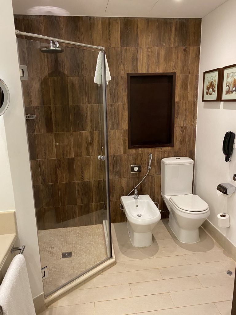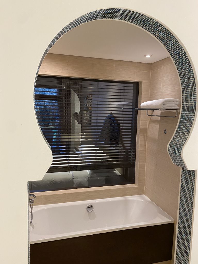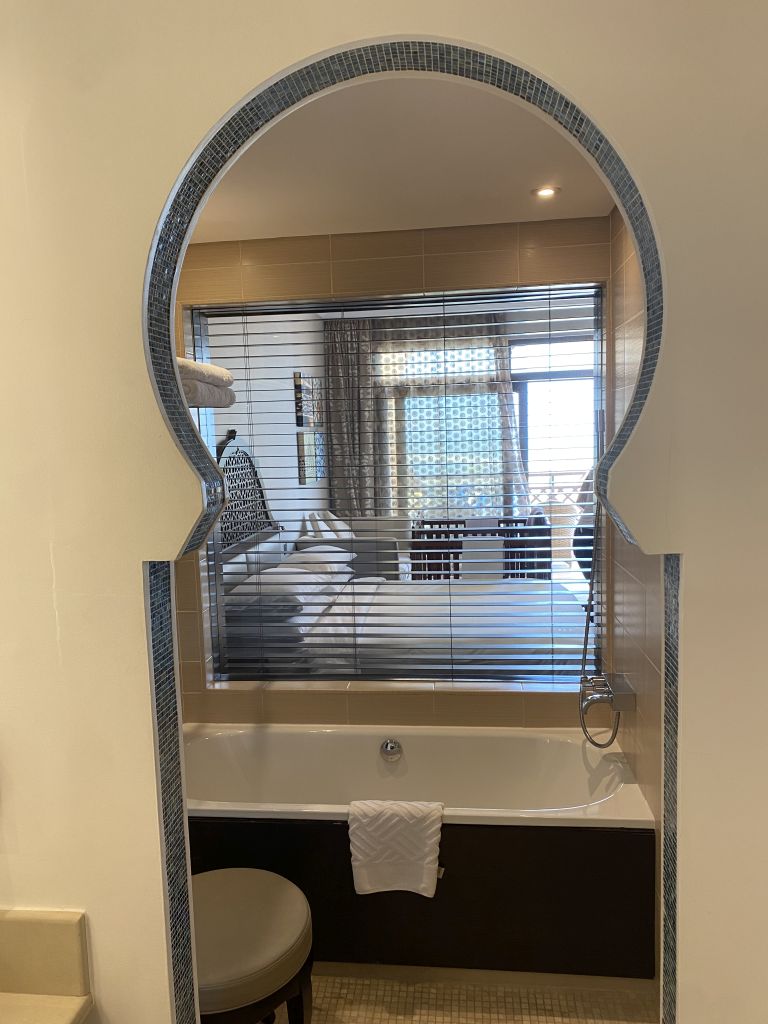 Das Badezimmer war für ein Resort typisch wirklich groß und verfügte über Dusche, Badewanne, WC und Bidet. An den Waschtischen standen Duschbad, Shampoo, Seife, Conditioner und Body Lotion der Marke Crabtree & Evelyn bereit. Direkt bei der Badewanne ermöglichte ein Fenster den Blick durch das Wohn- und Schlafzimmer Richtung Terrasse und (in unserem Fall) auf das Meer. Für Privatsphäre war durch eine elektrische Jalousie gesorgt.