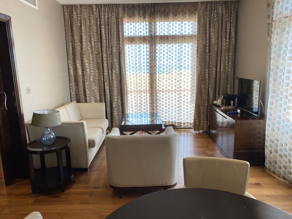 Das Design der Suite ähnelte dem unseres vorherigen Zimmers. Der Unterschied lag in der Größe und Ausstattung. Während die Bäder kaum voneinander abwichen, gab es ergänzend zum Schlafzimmer noch ein großes Wohn- und Esszimmer. Ausgestattet war der zusätzliche Raum mit einem Sofa, einem großen Esstisch mit Stühlen und zusätzlichen Sideboards und einem zweiten Fernseher.