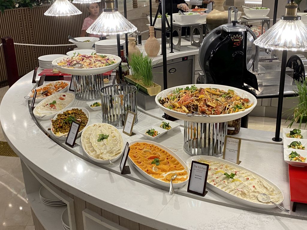 Inkludiert im All-Inclusive-Paket sind mit dem Frühstück, Mittagessen und Abendessen in „The Kitchen“ drei Hauptmahlzeiten. In allen anderen Restaurants und Bars kann vergünstigt jederzeit gespeist werden. Pro All-Inclusive-Gast werden dabei 70 AED vom Rechnungsbetrag abgezogen. So oft man möchte. Und in der Realität haben wir außer einmal beim Austern essen nie einen Betrag auf der Rechnung gehabt. Lediglich einmal gab es Diskussion, als ich meiner Frau etwas von der Frühstücks-Speisekarte der Dome Bar mit auf das Zimmer bringen wollte. Das wurde dann jedoch auch unkompliziert gelöst.