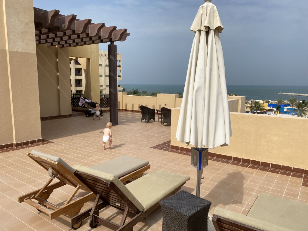 Doch auf unserem Zimmer wartete die nächste Überraschung. Statt eines King-Betts warteten Twin-Betten im Zimmer auf uns. Hier habe ich einen Fehler gemacht. Ein Family-Room war bisher für mich immer entweder ein größeres Zimmer mit Sofa-Bett oder ein Zimmer mit einem Nebenraum mit Betten für die Kinder. Aber im Hilton Ras al Khaimah sind scheinbar die Stand Twin-Bett-Zimmer die Familienzimmer. Genau das was wir nicht brauchen. Noch weniger Platz durch zwei Betten statt mehr Platz für die Babybetten.