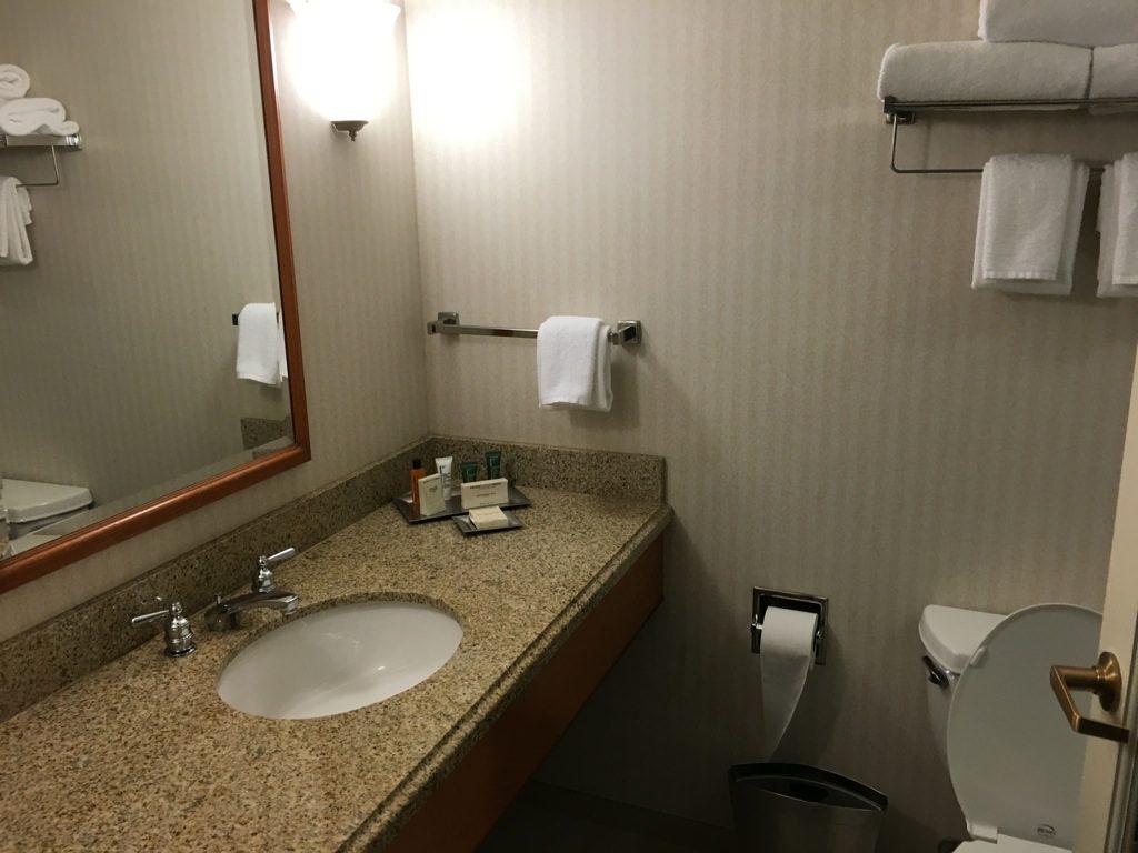 Das Bad war wieder US Hilton Standard. Ein Waschtisch und eine Badewanne mit Dusche. Ich werde übrigens nie verstehen, warum man in den USA immer Badewannen in Hotels verbaut.