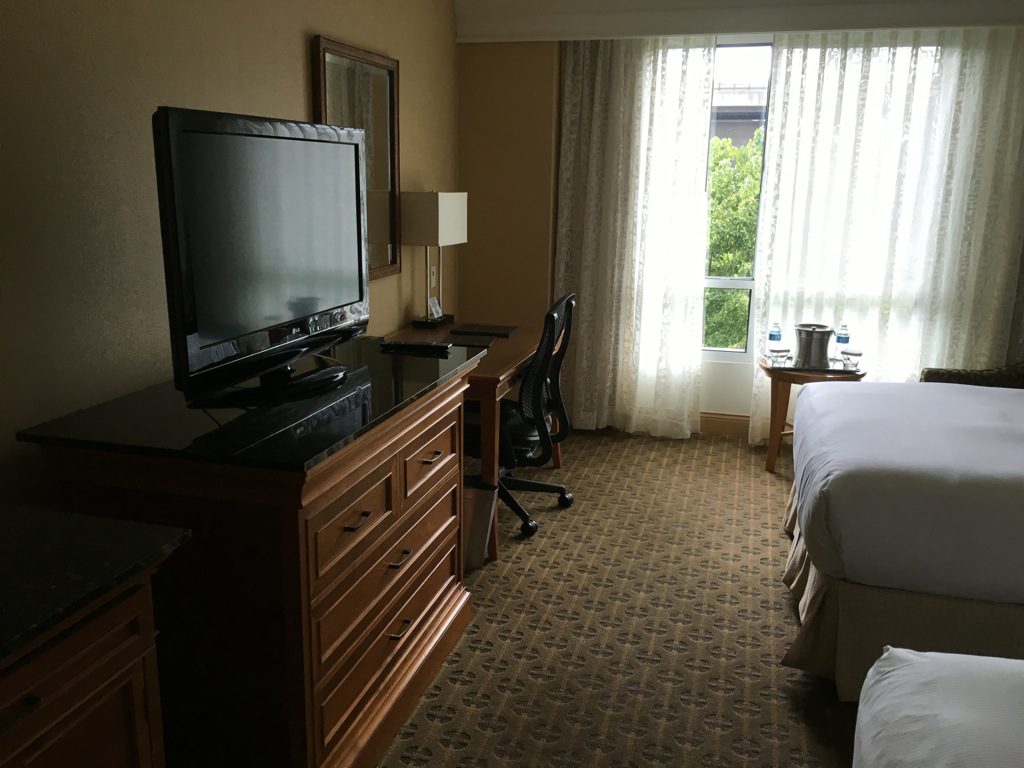 Das Zimmer selbst wirkte zwar etwas altmodisch und war noch nicht nach dem neusten Hilton Standard eingerichtet, allerdings war die Einrichtung gut in Schuss und nicht abgewohnt. Etwas überrascht war ich allerdings, dass die Zimmer für US Verhältnisse eher klein waren.