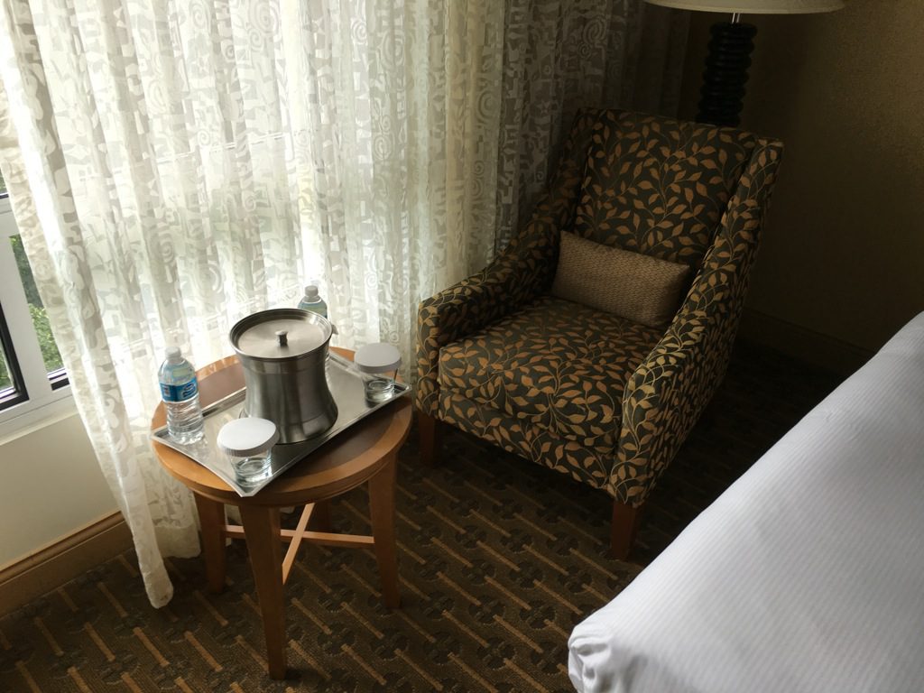 Wie in fast jedem Hotel der Hilton Kette gab es im Zimmer noch einen schönen Schreibtisch, einen großen TV und einen Sessel. Auch zwei Flaschen Wasser und der Eiseimer standen bereit.