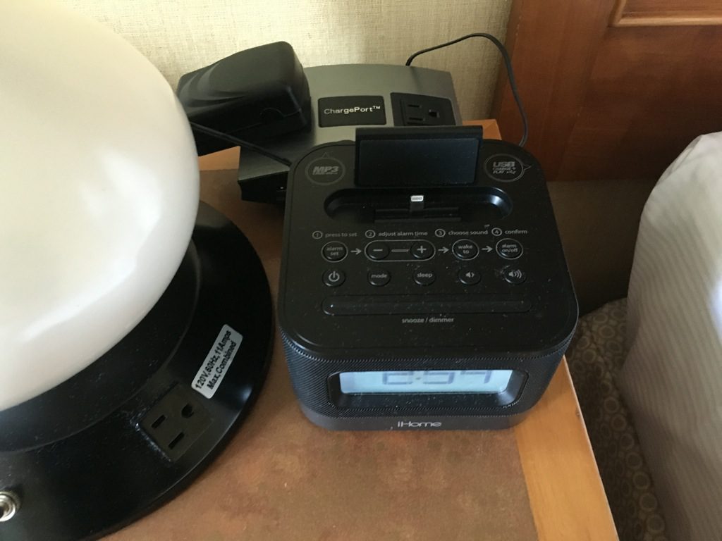 Schön bei Hilton finde ich immer die Details, wie die Station mit mehreren Steckdosen und USB Anschlüssen auf dem Schreibtisch und Nachttisch, sowie den Radiowecker mit Iphone Anschluss. Im Fall vom Hilton Seattle Airport, sogar bereits mit den neuen Anschlüssen für Modelle ab Iphone 5.