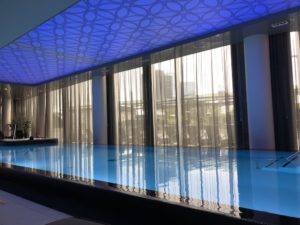 Es gab einige Liegen direkt am Pool, einen Raum für Massagen und einen separierten Ruhebereich. Auch ein Jacuzzi gehört zum Hilton Spa, daraus hat man einen guten Blick auf die Außenterasse.