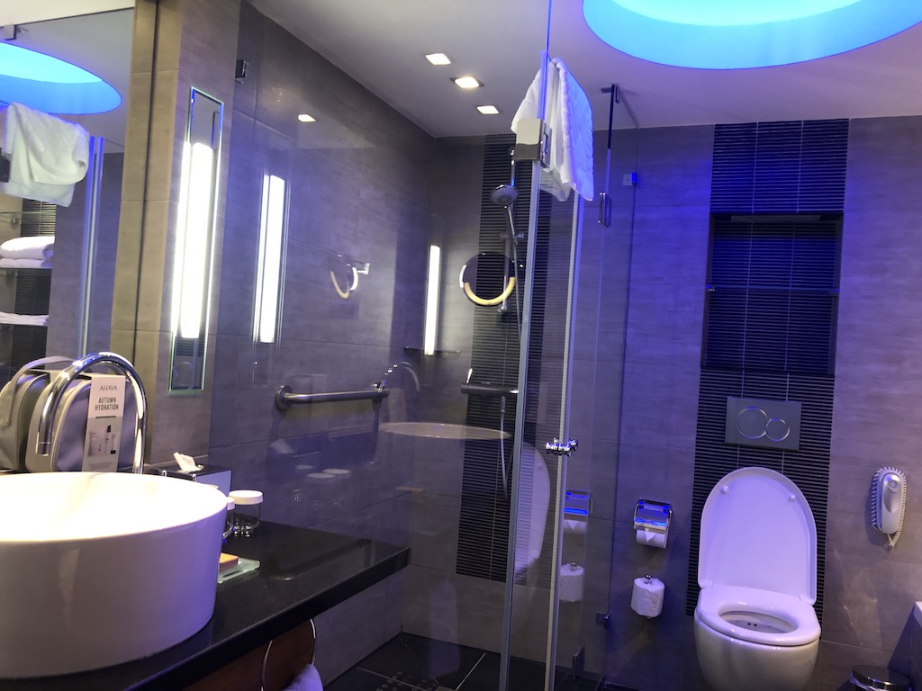 Das Badezimmer hat eine große Dusche, Blickfang ist die Beleuchtung. Eine Tasche mit Kosmetika vom Toten Meer lag neben den üblichen Pflegeprodukten bereit. Ich bin ein Fan von solchen Annehmlichkeiten, insbesondere auch als dann im Laufe des Tages noch Wein, Wasser, Obst und Pralinen ins Zimmer geliefert wurden. Eine Wertschätzung und schönes Gastgeschenk!
