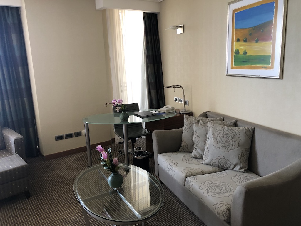 Highlight sind Balkon und der Ausblick. Durch die großen Fenster sind die Zimmer auch relativ hell. Der Raum war in einem sehr sauberen Zustand, auf dem Tisch standen frische Blumen. Ein Wasserkocher für Kaffee und Tee stand mit zwei Flaschen Wasser bereit, die Minibar war üppig bestückt.