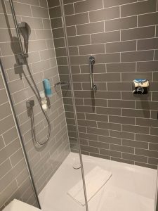 Das Badezimmer war sehr sauber und top modern. Es bestand aus Toilette, Waschtisch und einer Dusche. Den Fön fanden wir in einer Nische beim Bügelbrett im Wohnbereich. Auf Pflegeprodukte in kleinen Flaschen mussten wir wie gewohnt in Holiday Inn Express Hotels verzichten. Duschbad und Shampoo kommen aus an der Wand montierten Spendern.