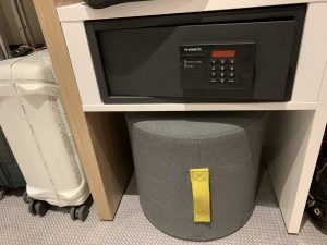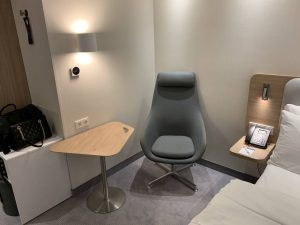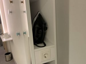 Darüber hinaus war die Zimmer-Ausstattung wie gewohnt: Ein bequemer Sessel, dazu ein Hocker. Ein ausreichend großer Flachbildfernseher und ein Safe. Auf eine Minbar oder einen Kühlschrank mussten wir jedoch verzichten. Dafür gab es eine Garderobe, Wasserkocher mit Instant-Kaffee und Tee sowie Bügeleisen und Bügelbrett.