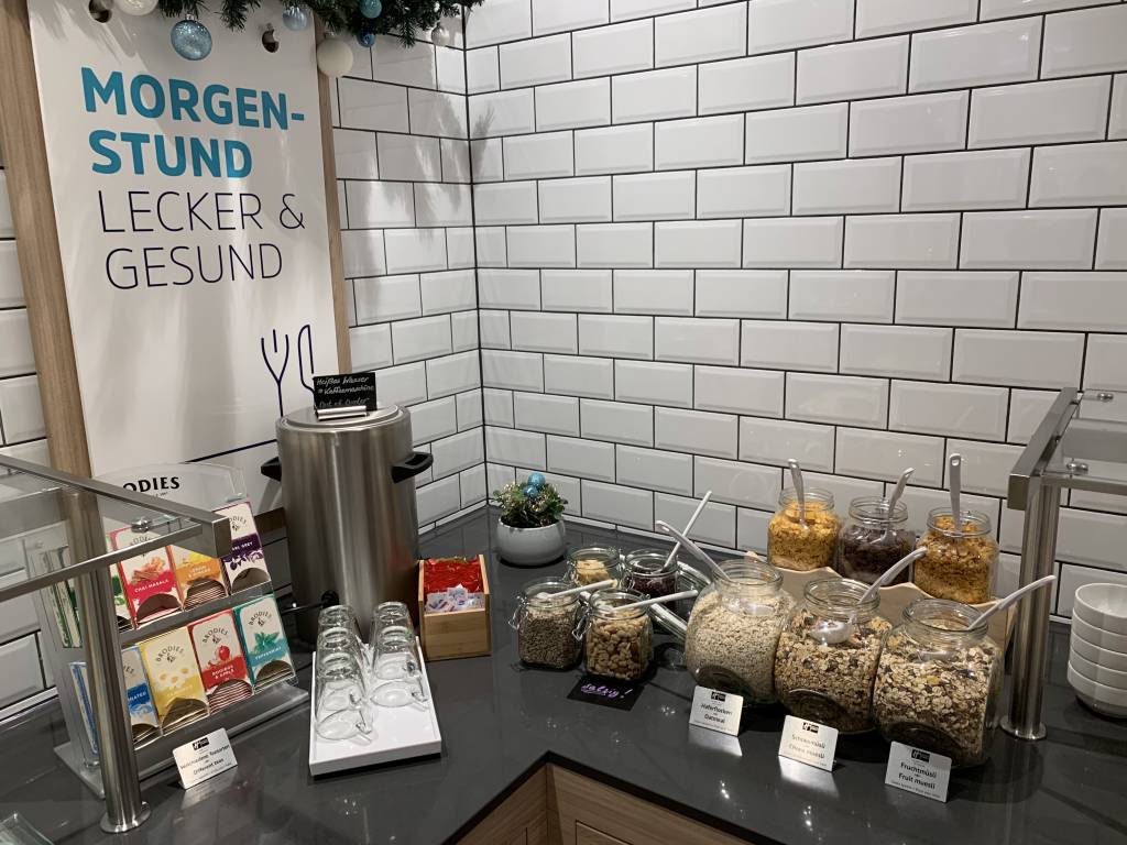 Das Frühstück im Holiday Inn Express Erlangen war vielleicht der Überraschungsmoment des gesamten Aufenthalts. So gibt es immer einige Standards, wie Wurst-Aufschnitt und Eier. Außerdem gibt es immer kalte Speisen bestehend aus Käse, Joghurts, Obst bzw. Obstsalaten. Ergänzend steht standardmäßig eine Auswahl an Brot und Brötchen sowie Gebäck und Müslis bereit.