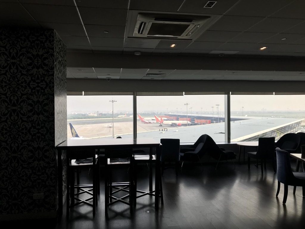 Neben Obst gab es Ei und Würstchen, indische warme Speisen, Toastbrot, Honig, Butter, eine Sorte Marmelade, Müsli und zwei Sorten Saft. Das Highlight des Frühstücks war definitiv der Blick auf das Vorfeld.