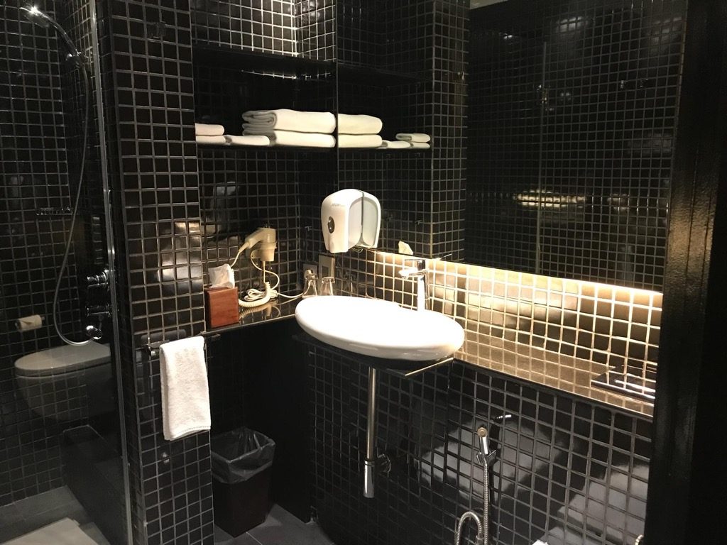 Hinter der Eingangstür rechts befand sich das Bad. Neben einer Dusche, einem Waschbecken und einer Toilete befand sich nicht sonderlich viel im Bad. Amenities waren keine vorhanden, es stand aber ein Zettel bereit, dass man sie sich bei Bedarf an der Rezeption holen könne. Das Bad war nichts Besonderes, dennoch war es in einem guten Zustand und sauber.