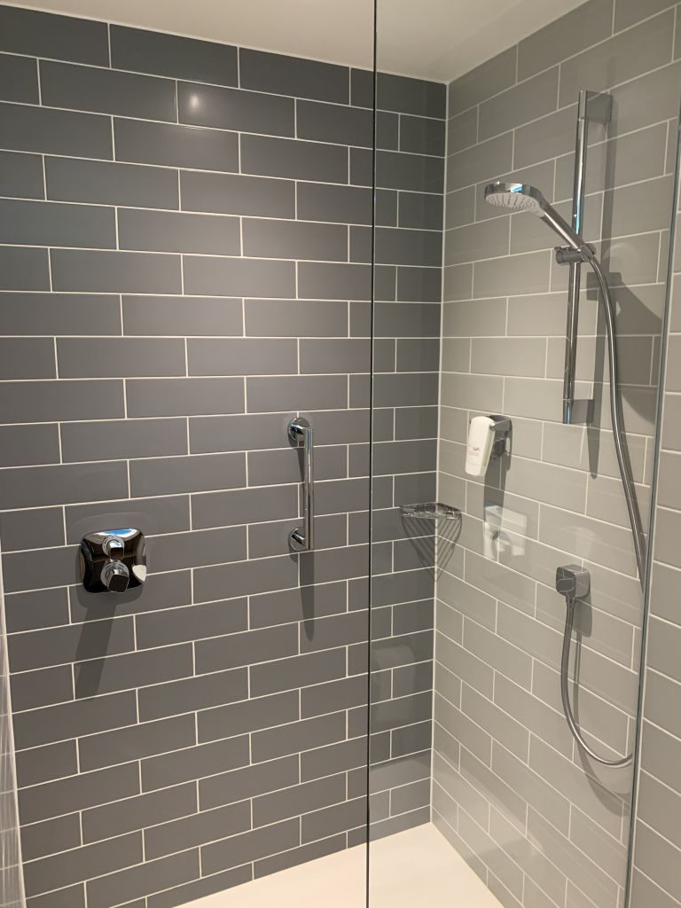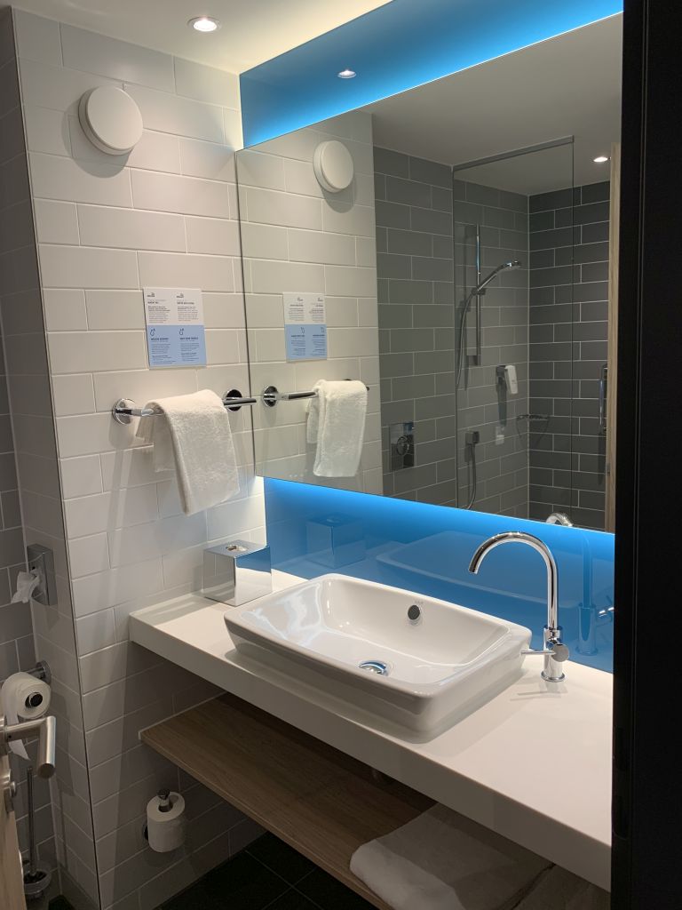 Auch das kleine Bad machte einen guten Eindruck. So gab es neben dem Waschtisch und der Toilette auch eine bodentiefe Dusche. Pflegeprodukte wurden, wie für Holiday Inn Express typisch, nicht bereitgestellt. Es gab in der Dusche lediglich eine Seife-Conditioner-Shampoo-Kombination aus dem Spender. Ein weiterer Seifenspender befand sich am Waschtisch.
