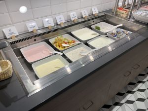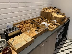 Es gab Brot, Toast, Croissants und weitere Backwaren zur Auswahl. Als Belag dafür standen mehrere Wurst- und Käse-Sorten zur Auswahl. Alles war ausreichend vorhanden und wurde ordentlich präsentiert.