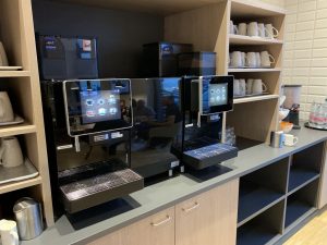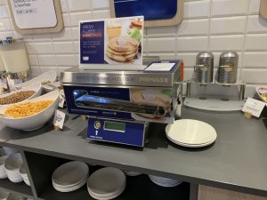 Für die Zubereitung von Kaffee- und Tee standen zwei Kaffeevollautomaten bereit. Und natürlich durfte auch in diesem Holiday Inn Express der Pfannkuchen-Automat nicht fehlen.