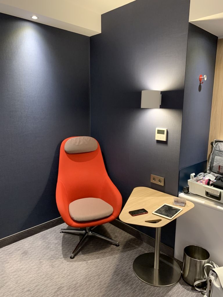 Das Zimmer an sich war eines der typischen Standard-Zimmer aus der aktuellen Holiday Inn Express Generation. Neben dem Bett befindet sich im Zimmer ein Stuhl, ein kleiner Arbeitstisch, ein Hocker und eine Koffer-Ablage. Als Schrank dient eine schmaler Spalt in der Wand mit ein paar Kleiderbügeln. Weitere Kleidung kann man an Haken an der Wand aufhängen.