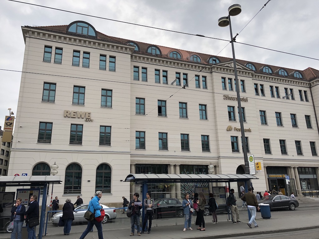 Wie bereits erwähnt liegt das Hotel nur einen Gang über die Straße vom Hauptbahnhof. Von meinem ICE nahm ich den zentralen Ausgang, überquerte die Straße und befand mich in rund 80 Sekunden bereits im Eingangsbereich des Hotels, welcher leicht anhand eines Schriftzuges am Hotelgebäude zu finden ist. Ein gewaltiges Eingangsportal mit Bellboys wird man hier jedoch vermissen. Der Eingang wirkt mit einigen Pflanzen eher schlicht, was sich jedoch ändert, sobald man die Lobby im ersten Obergeschoss betritt (Fahrstühle sind verfügbar).