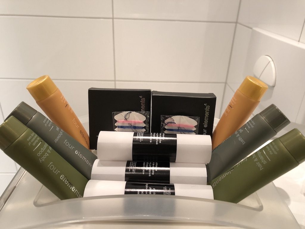 Zur rechten befindet sich das Bad, welches es in diesem Hotel in zwei Ausführungen gibt – entweder mit Dusche, oder mit Badewanne. Die Badezimmer-Amenities von four elements waren ausreichend vorhanden und ich empfand sie als hochwertig. Kleines Manko in der Dusche war der etwas schwache Wasserdruck.