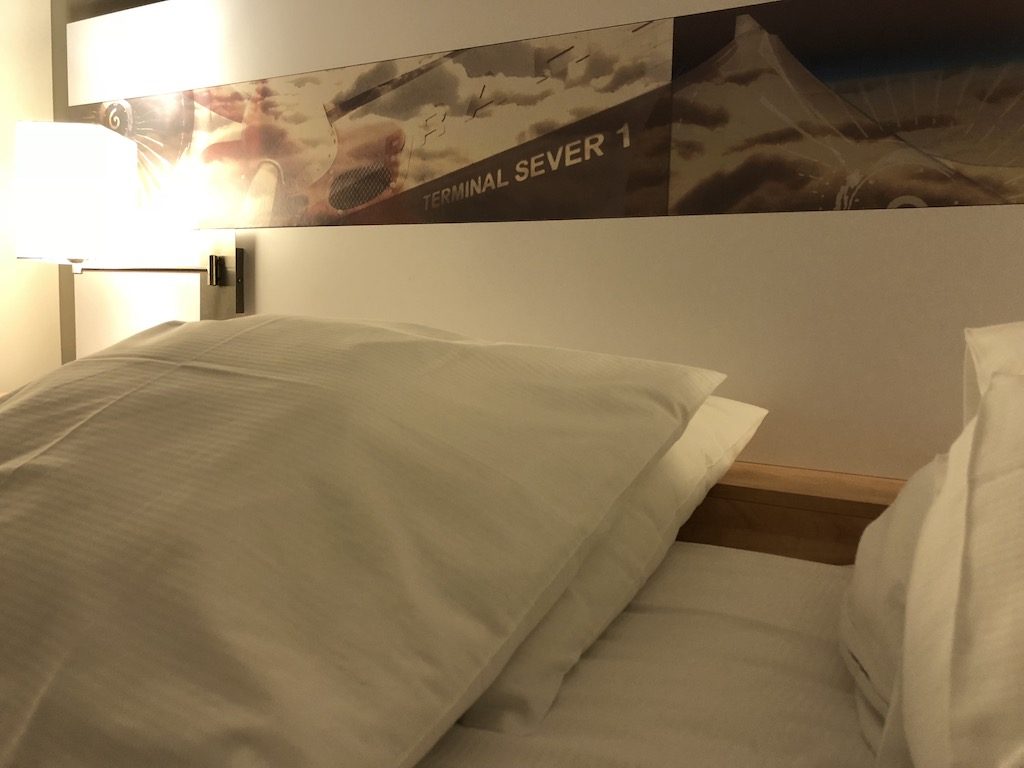 Das Holiday Inn am Flughafen ist noch relativ neu und bietet minimalistische, aber ausreichend möblierte und komfortable Zimmer mit dezenter Anlehnung an die Lage am Flughafen durch Bilder am Bett.