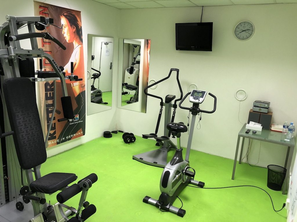 Da ich morgens früh aufwachte, wollte ich die Zeit für einen schnellen Workout nutzen. Das Hotel selbst hast nur eine Mini-Gym mit einer handvoll Geräten. Den Zugang erhält man indem man sich eine Zugangskarte an der Rezeption abholt und die Mini-Gym im fensterlosen Kellergeschoss aufsucht. Zur Verfügung standen je zwei Cardio und zwei Kraftsportgeräte. Für die Basics genügt die Gym, und bietet neben einem Fernseher, einer Musikanlage auch kostenfreies Wasser und natürlich Handtücher, sowie Desinfektionsmittel.