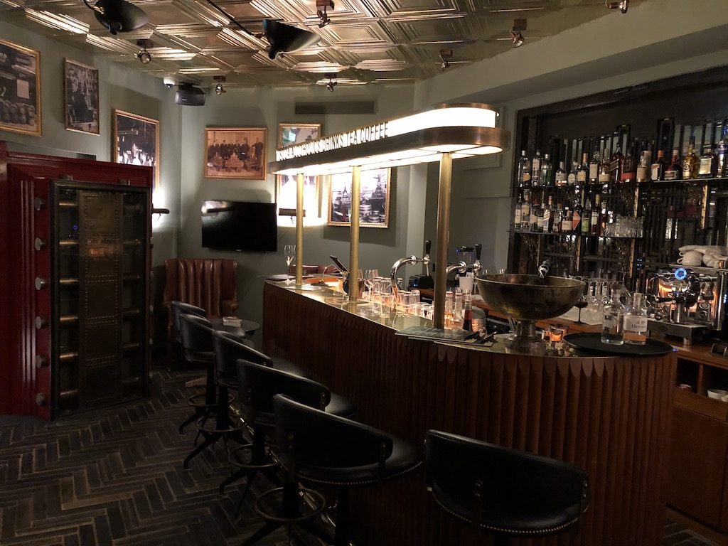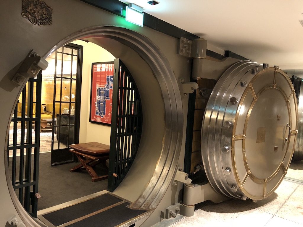 Das besondere Schmuckstück des Hotels ist die Bar im Untergeschoss des Hotels – aber wieso im Keller? Natürlich, da sich dort die alten Tresore der ehemaligen Bank befinden, in welcher neben einem Konferenzraum auch die Bar untergebracht ist. Fast immer bin ich von Hotelbars enttäuscht, da diese oftmals weder besonders gemütlich noch in einer bestimmten Art speziell sind. Ganz anders jedoch diese Bar, in welcher die Theke das zentrale Element ist, und auf mehreren Ebenen Sitzmöglichkeiten geboten werden. An den Wänden befinden sich zahlreiche Fotografien aus alten Zeiten Den Haags und angrenzend befindet sich die gewaltige Tresortür, welche die Bar von dem Konferenzraum trennt.