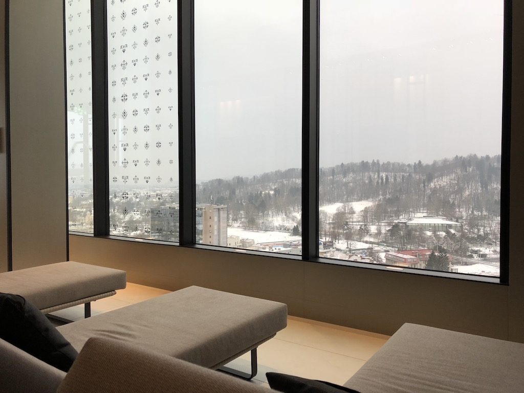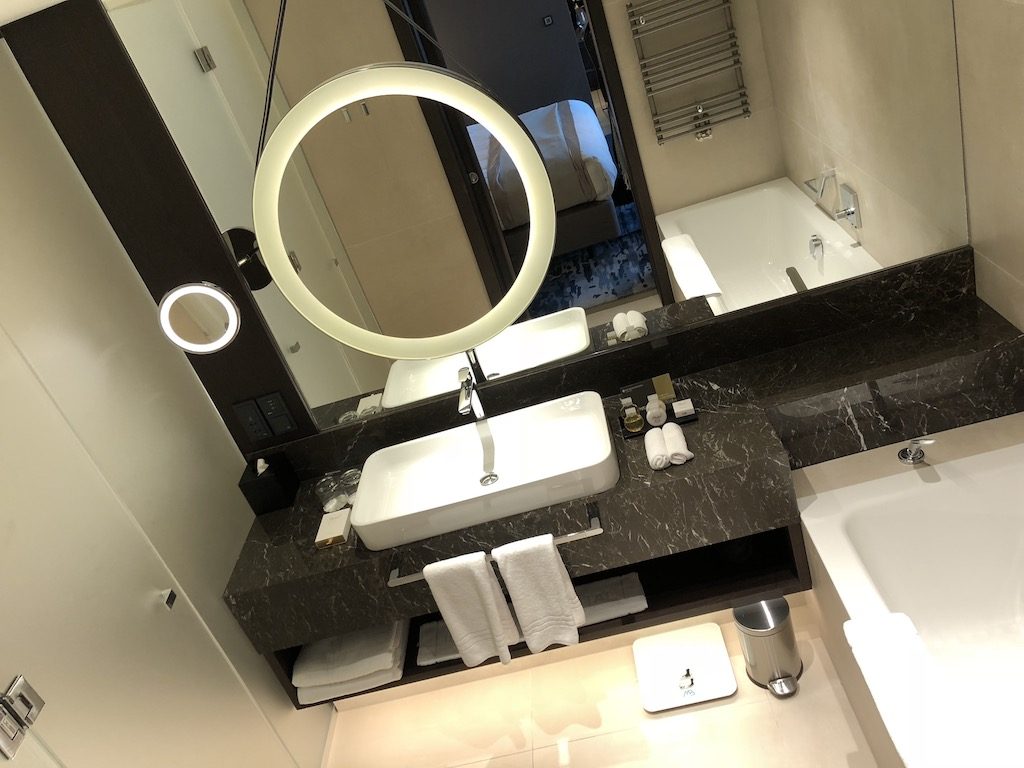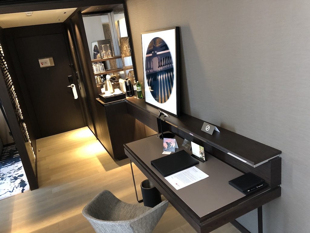 Im Eingangsbereich findet sich ein Schrank, sowie eine gut gefüllte Minibar und Nespresso Kaffeemaschine. Hieran schließt der Wand entlang ein Schreibtisch zum Arbeiten, welcher ausreichend Steckdosen bietet. Zur rechten befindet sich ein halb abgetrenntes Wohnzimmer mit Couch und Fernseher.  Am Schreibtisch vorbei gelangt man in den Schlafbereich mit einem Kingsize-Bett, sowie einem weiteren Fernseher. Hieran schließt sich ein begehbarer Kleiderschrank, sowie ein Badezimmer mit bodengleicher Dusche, sowie einer Badewanne. Das Zimmer ist entlang der gesamten Fassade verglast und bietet somit ausreichend Tageslicht und tolle Ausblicke über die Stadt und die umliegenden Gebirge. Die Vorhänge (halbtransparent und vollverdunkelnd) lassen sich natürlich elektrisch schließen und öffnen.