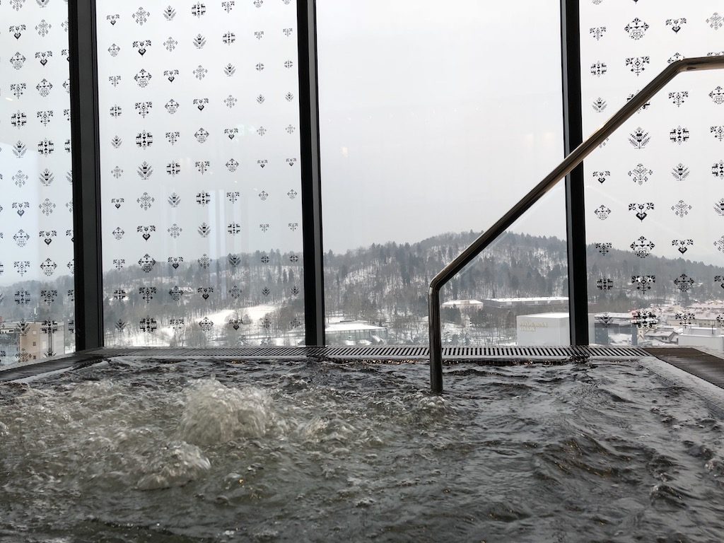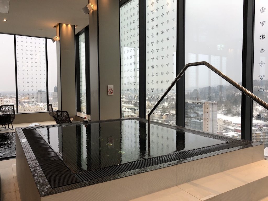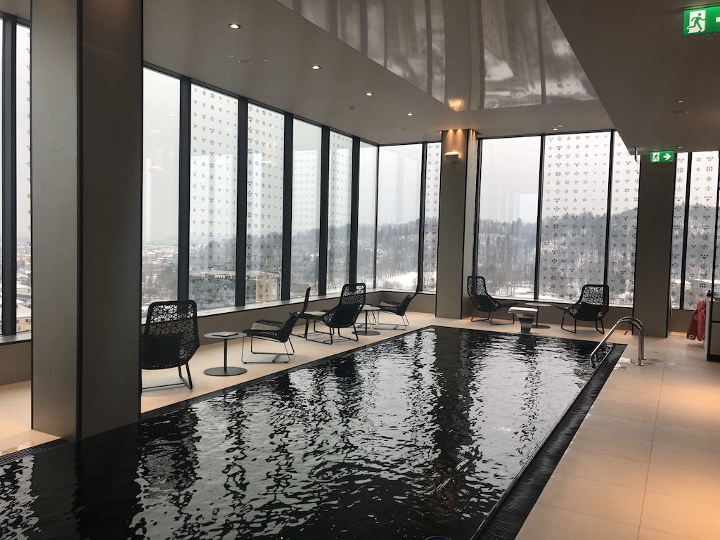 Auf dem 20. Stockwerk befindet sich der Spa- & Wellnessbereich des Hotels, welcher für alle Gäste zugänglich ist und erneut ein Panorama über die Stadt bietet. Wie üblich sind Umkleiden mit Duschen dem Wellnessbereich vorgelagert, woraufhin man nach einer kurzen Fußdusche in den Nassbereich gelangt. Ein großer und vergleichsweise tiefer Pool lädt ein, einige Bahnen zu ziehen und ein Whirlpool dient der anschließenden Entspannung. Innerhalb dieses Bereiches liegen auch eine schwedische Sauna, eine Dampfsauna, sowie eine Infrarotsauna – diese sind also nicht geschlechtergetrennt und werden vermutlich in der Regel mit Badetextilien, oder zumindest einem Handtuch besucht.