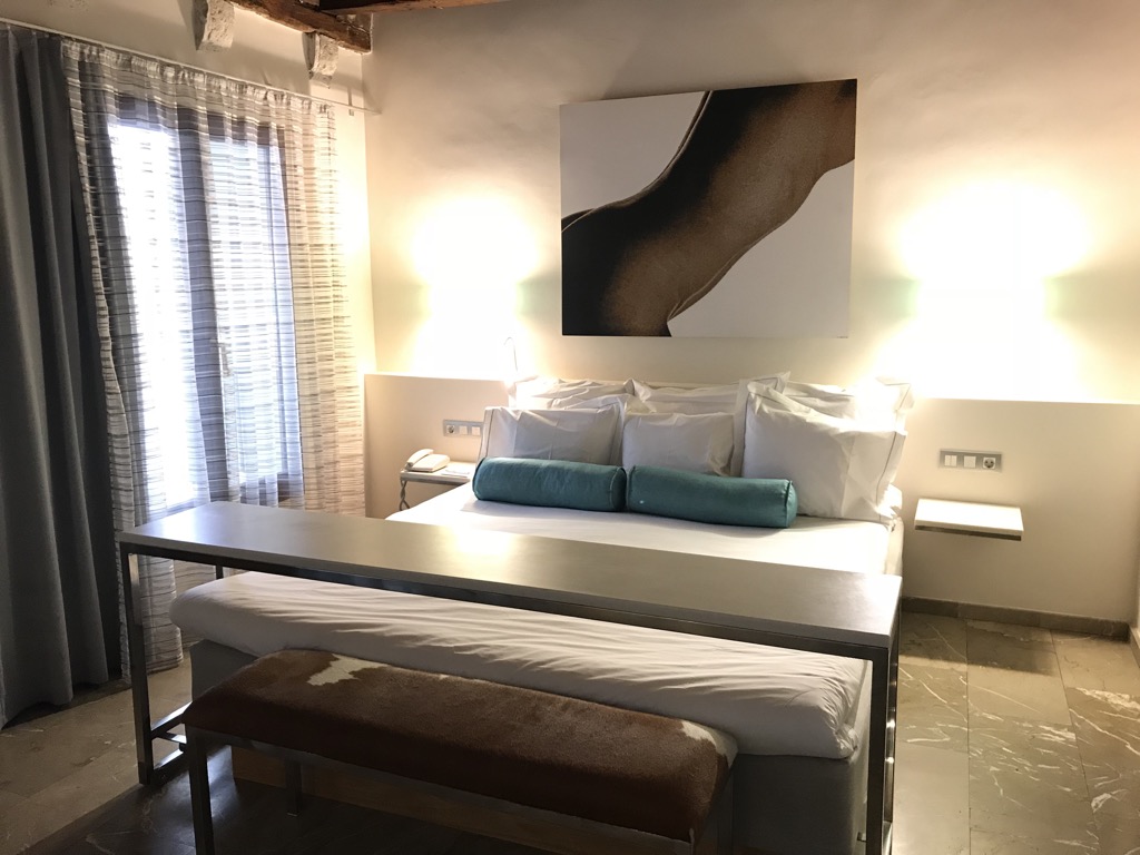 Nach Betreten des Zimmers befand sich das große Doppelbett auf der rechten Seite. Auf dem Bett befanden sich 8(!!) Kissen in unterschiedlichen Größen und Härtegraden. Sehr angenehm war auch die weiche Decke. „Richtige“ Bettdecken sind nicht üblich in Spanien. Oft gibt es nur Leinendecken – für mich leider nicht ausreichend. Dementsprechend glücklich war ich natürlich auch ;). Neben dem Bett befand sich rechts und links je ein Nachttisch. Vor dem Bett befand sich noch eine Sitzbank, die auch als Kofferablage wunderbar genutzt werden konnte. Oberhalb der Bank befand sich noch ein Rolltisch, der über die komplette Breite des Bettes stand. Hier konnte man wunderbar im Bett sitzend arbeiten oder lesen.