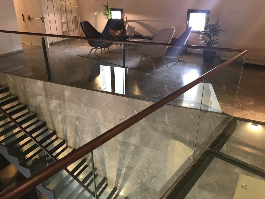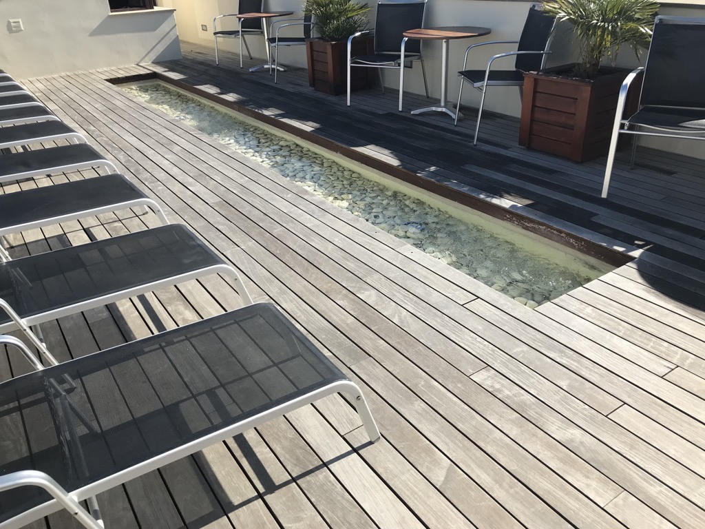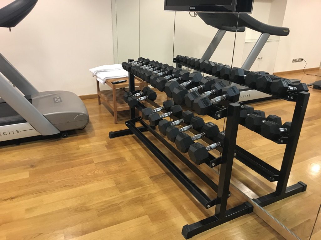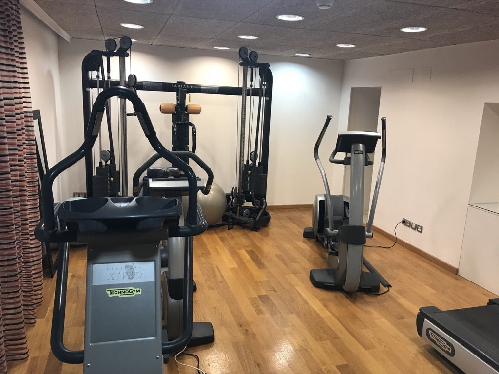 Im Hotel Tres kann man nicht nur schlafen. Es bietet noch einiges mehr. Das umfassende Angebot hat mich sehr positiv überrascht. Vom Innenhof aus kommt man mit der Zimmerkarte in einen Fitnessraum, in dem neben einigen Cardiogeräten auch Kraftgeräte und Hanteln zu finden sind.