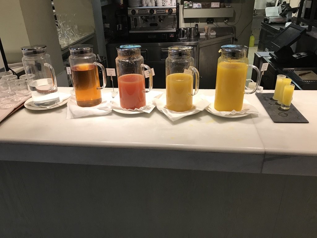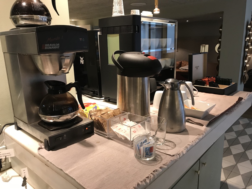 An einer Kaffeemaschine konnte man sich seine Kaffeespezialität selbst zubereiten. Für Teeliebhaber war natürlich auch ausreichend gesorgt. Zusätzlich zu den Heißgetränken gab es auf dem Buffet noch mehrere Säfte, Wasser und (Tages-) Smoothies.