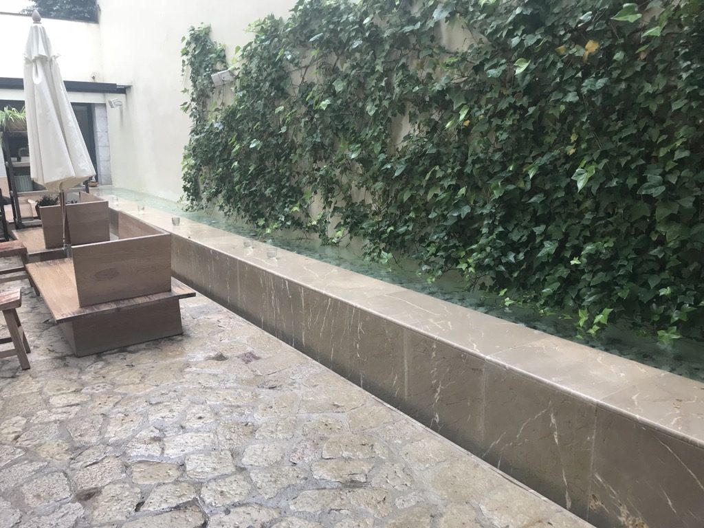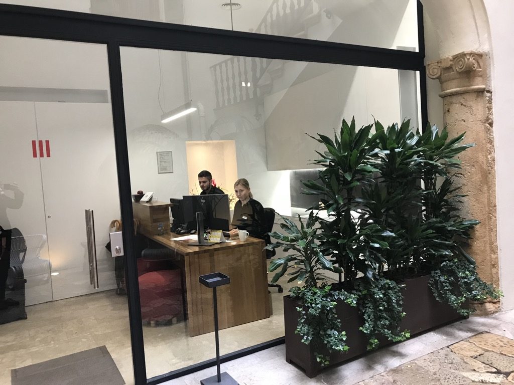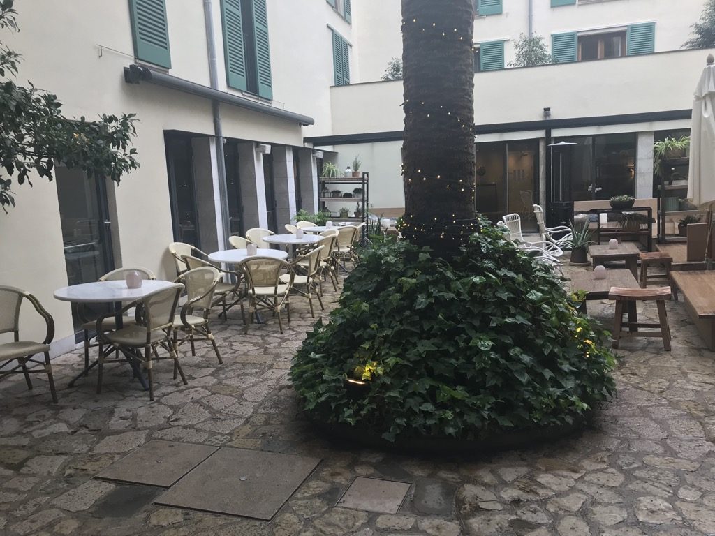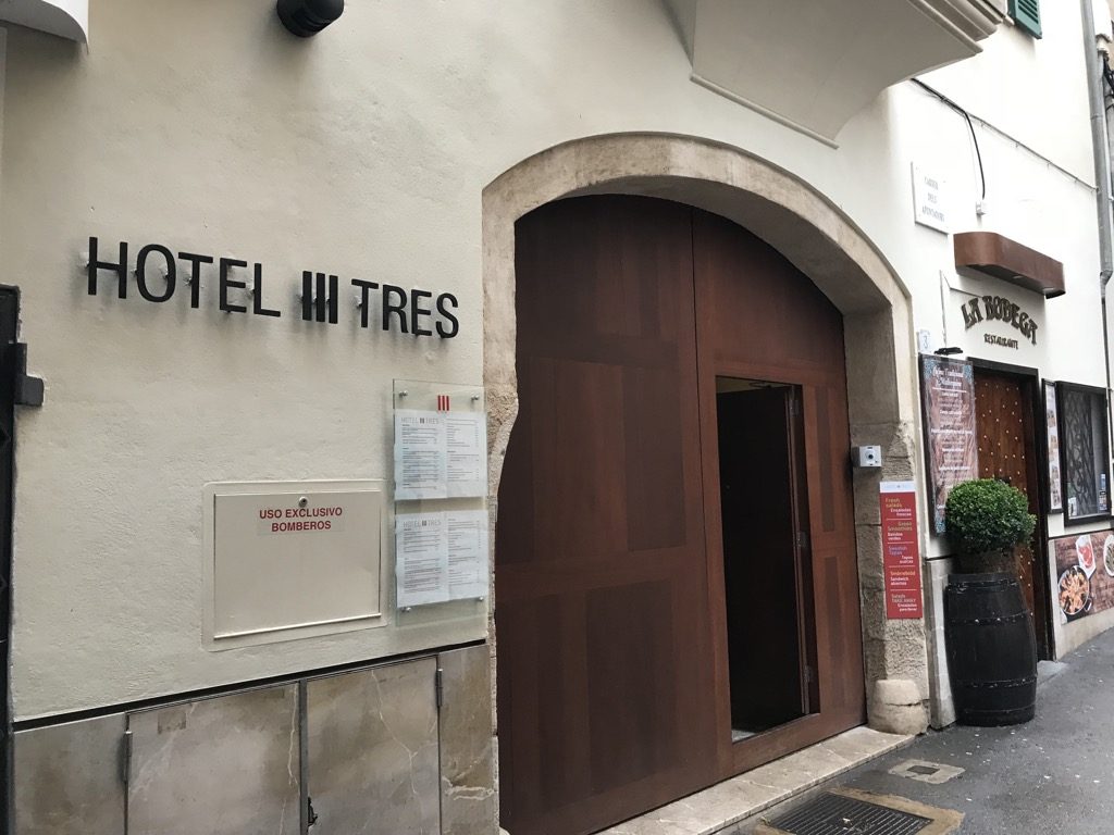 Nach dem Erstflug mit Laudamotion nahm ich mir ein Taxi nach Palma de Mallorca. Ich hatte nur eine Nacht bis zu meinem Rückflug, deshalb wollte ich möglichst zentral in Palma de Mallorca wohnen, um die Altstadt, den Hafen und das Meer zu besuchen. Auf booking.com habe ich das Hotel Tres gefunden. Die zentrale Lage, die Optik und die Bewertungen haben mich direkt angesprochen. Ich habe mich am Kreisel, direkt um die Ecke des Hotels absetzen lassen und bin die kleine Gasse zum Hotel zu Fuß gelaufen. Im ersten Moment war der Eingang sehr unscheinbar, aber was sich dahinter verbarg, war beeindruckend.