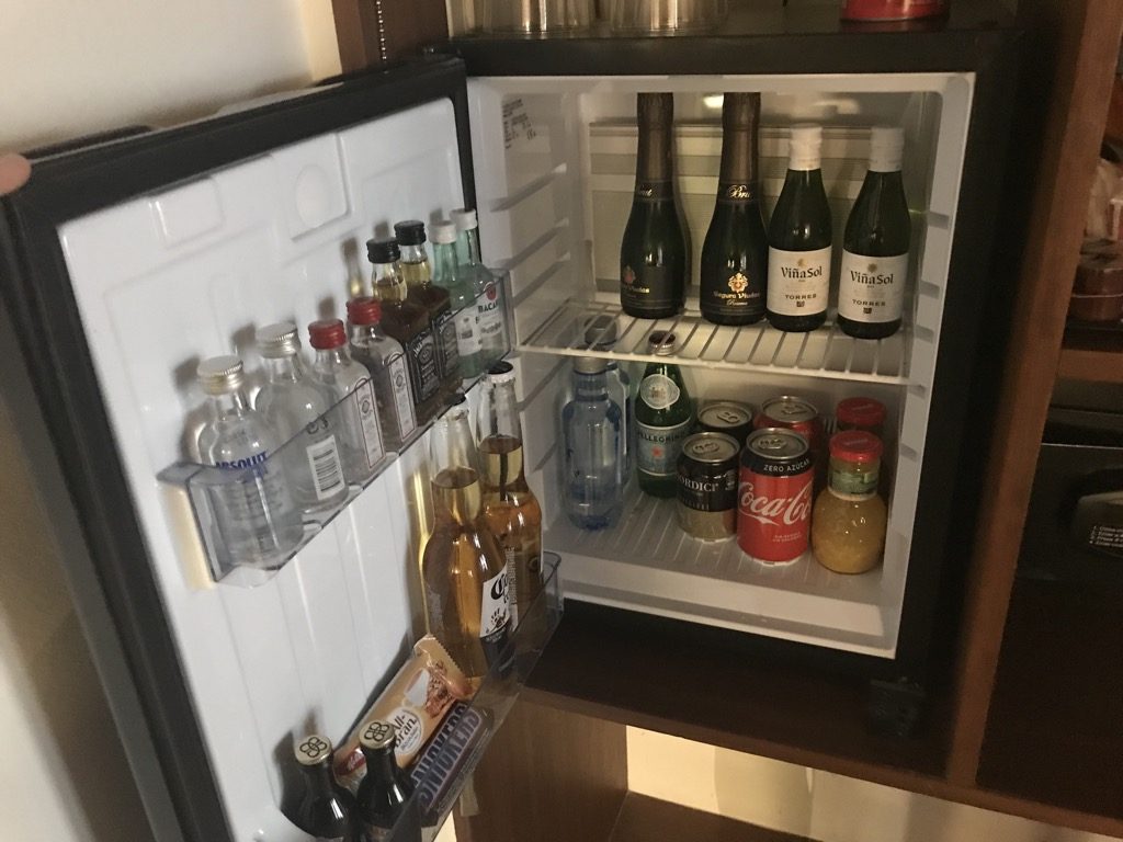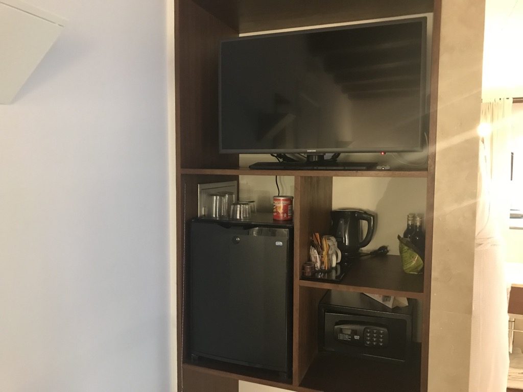 Auf der linken Seite vor dem Bad befand sich noch ein Regal mit Minibar, Teestation und Fernseher.