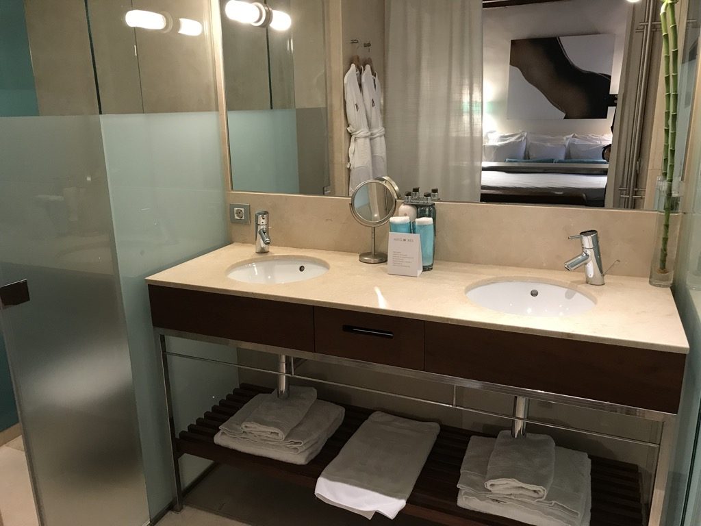 Mittig im Bad befand sich das große Waschbecken, das viel Ablagefläche bot. In einer Schublade unterhalb des Waschbeckens befanden sich einige Amenities. Amenities finde ich persönlich immer sehr angenehm. Ich habe mir mittlerweile abgewöhnt mit Shampoo oder Wattestäbchen zu reisen.