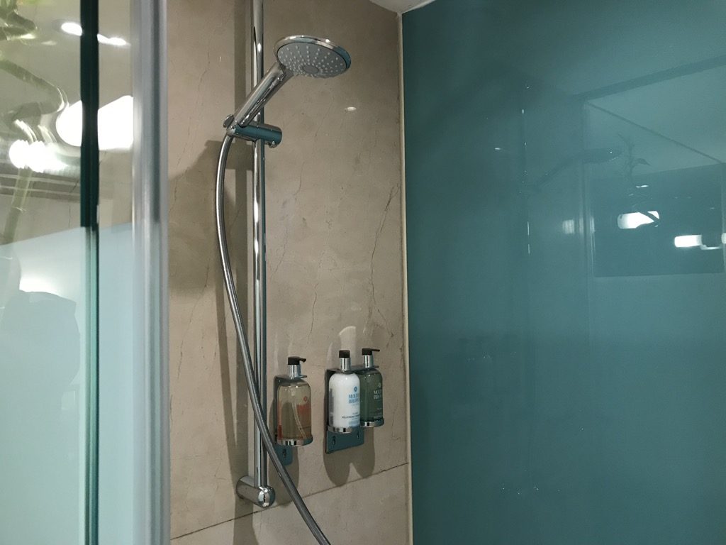 Neben dem Schrank konnte man, ebenfalls durch einen Vorhang, das Bad betreten. Rechts im Bad befand sich eine große Dusche, in der Shampoo, Duschgel und Conditioner in ausreichender Menge vorhanden waren.