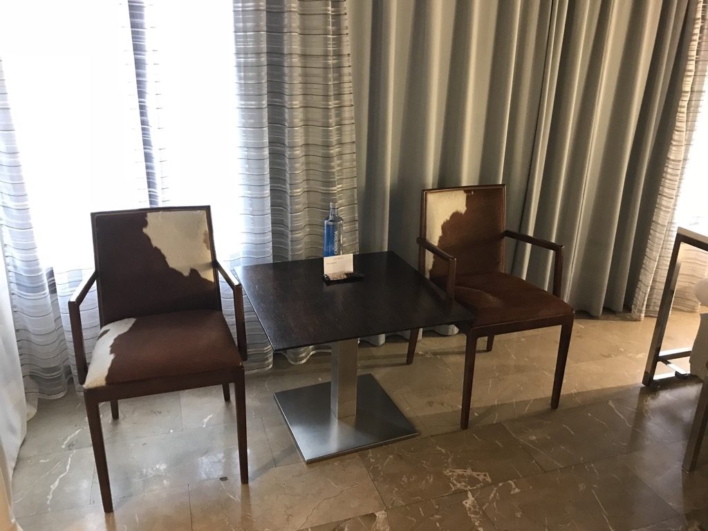 Vor den Fenstern stand ein kleiner Tisch mit zwei Stühlen. Auf dem Tisch befanden sich Mandeln und eine ein Liter Flasche stilles Wasser. Ich empfinde es immer als sehr positiv, wenn es im Hotel eine Flasche kostenfreies Wasser gibt.