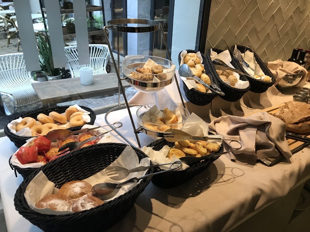 Das Frühstück im Hotel Tres, durfte ich wie bereits erwähnt sogar zwei Mal genießen. Wenn man den großzügigen und schön gestalteten Innenhof durchquerte, kam man in das neuere Gebäude. Hier befand sich unter anderem auch der Frühstücksbereich inkl. Bar.Man findet alles, was das Herz begehrt. Neben Eierspeisen gab es noch Würstchen und Bacon als warme Alternativen. Auch für Spanien nicht ganz üblich, gab es leckeres frisches Körner- und Roggenbrot. Toast und süße Backwaren gab es natürlich auch.