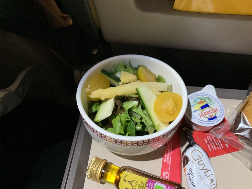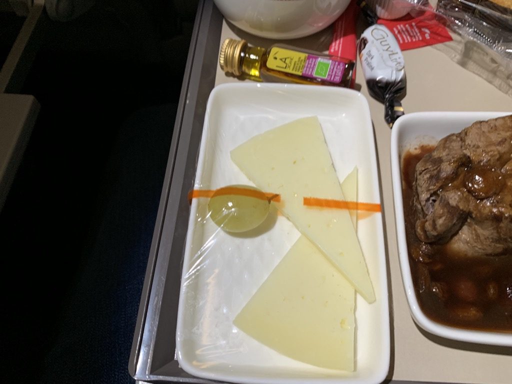 Das Essen wurde dann komplett auf einem Tablett serviert. Hier haben die beiden Herren in der Business Class allerdings ein wenig geschlafen, denn den Salat und den Käse hätte man in meinen Augen auch von der Folie befreien können, was sehr schnell passiert ist und einen wesentlich besseren Eindruck macht.