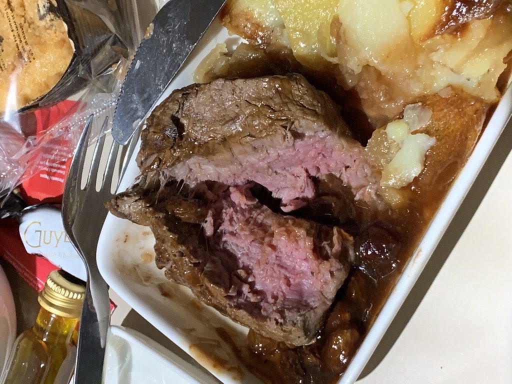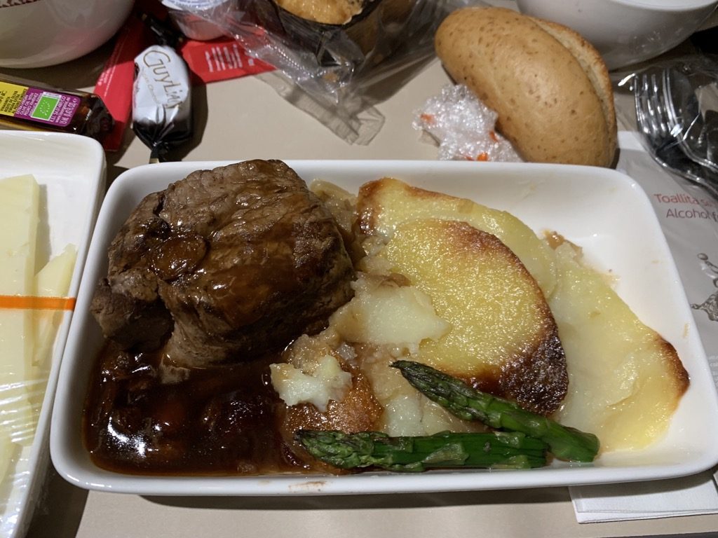 Mit dem ersten Getränk wurden dann auch die Wünsche für den Hauptgang abgefragt. Bei der Wahl zwischen Nudeln und Rindfleisch habe ich mich für letzteres entschieden und war sehr gespannt, wie Iberia dies auf der Kurzstrecke hinbekommt.