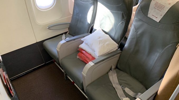 Der einzige Unterschied zwischen der Iberia Business Class und der Economy Class im Airbus A319 ist der freie Mittelsitz in jeder Dreierreihe. Iberia hat noch nicht einmal einen Vorhang zwischen den beiden Kabinen verbaut, sodass hier auch kein wirklich exklusives Gefühl aufkommt.