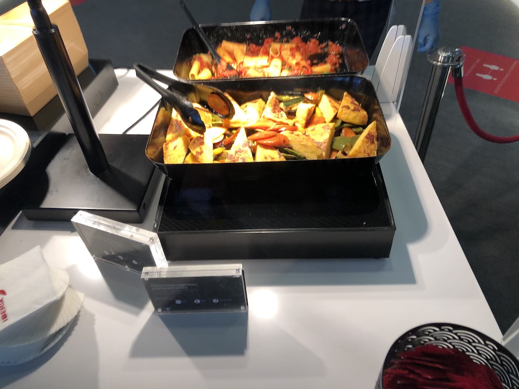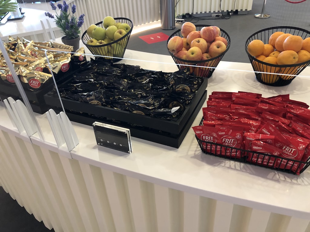 An den beiden Buffet-Inseln wurden zahlreiche verpackte Snacks und Obst bereitgestellt. Neben Crackern, Chips und Nüssen gab es frische Sandwiches, Wraps, Salate und Gazpacho. Alles in Einzelportionen verpackt und so auch gut zur Mitnahme geeignet, auch wenn dies nicht im Sinne des Betreibers sein mag.