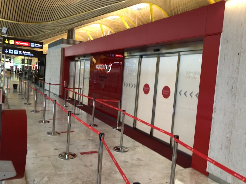 Die andere Lounge „Velázquez“ im Satellitenteil des T4 ist vorübergehend geschlossen. Damit bleibt aktuell nur die Dali-Lounge, die während meines Besuchs nicht stark frequentiert war. Schon am Eingang ist bereits die erste Schutzmaßnahme zu erkennen: Absperrbänder, Schilder und Pfeile sollen für Distanz sorgen.