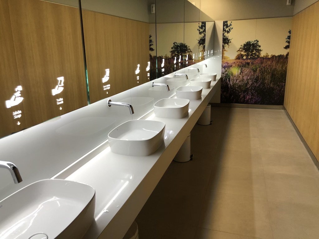 Die automatische Zugangstür zu den Waschräumen war schon vor der Pandemie sehr praktisch. Die Toiletten waren sehr sauber, laut Homepage haben inzwischen auch die Duschen wieder geöffnet. Dort gibt es nun Einweg-Pflegeprodukte, Spender mit Desinfektionsmittel stehen in allen Bereichen bereit.