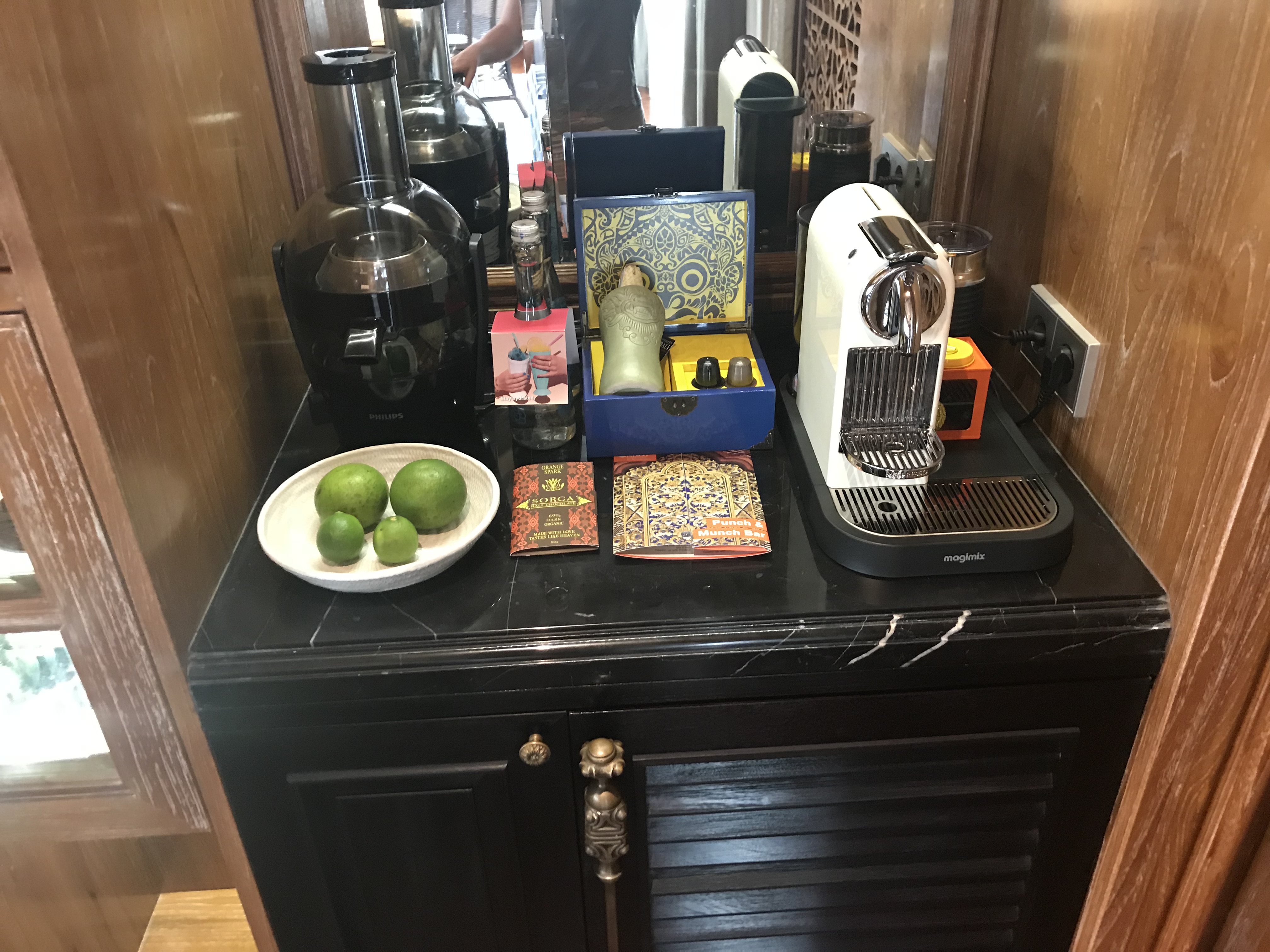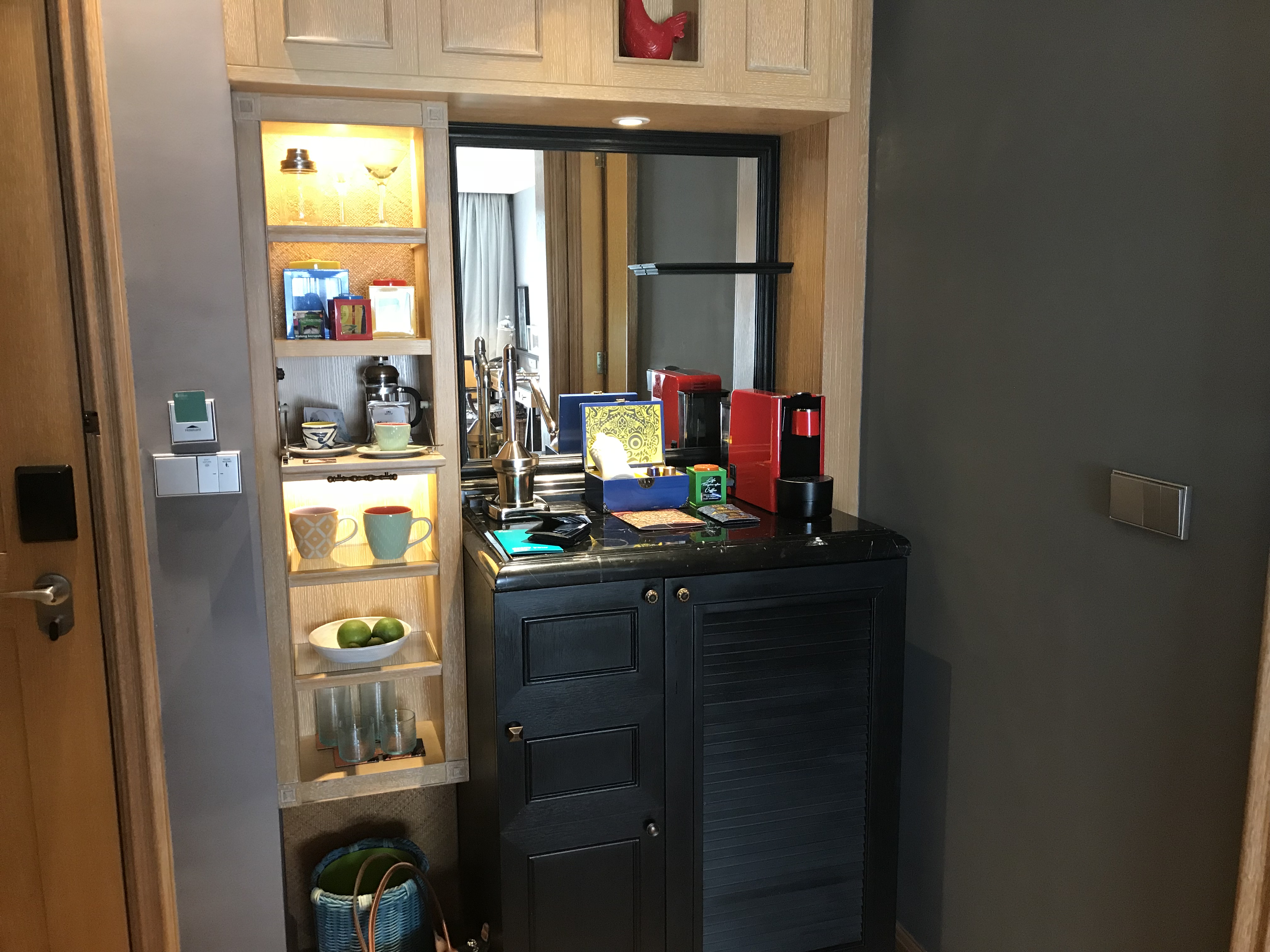 Das Zimmer verfügt über einen kleinen Eingangsbereich, der mit Schirmständer, und einer Munch&Punch Bar ausgestattet ist. Die Munch&Punch Bar ist keine normale Tee-Station, sondern sie bietet neben einer Kaffeemaschine auch noch einen Entsafter mit täglich frischen Orangen, einer Cocktailanleitung inkl. Zutaten, Schokolade und einer Minibar. Den Entsafter fanden wir klasse, ebenso wie die Orangen, die täglich frisch aufgefüllt wurden.